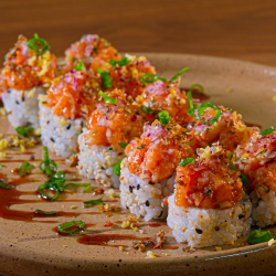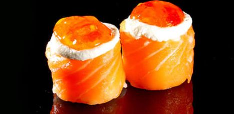 Enrolado de aroz recheio de salmão grelhado,