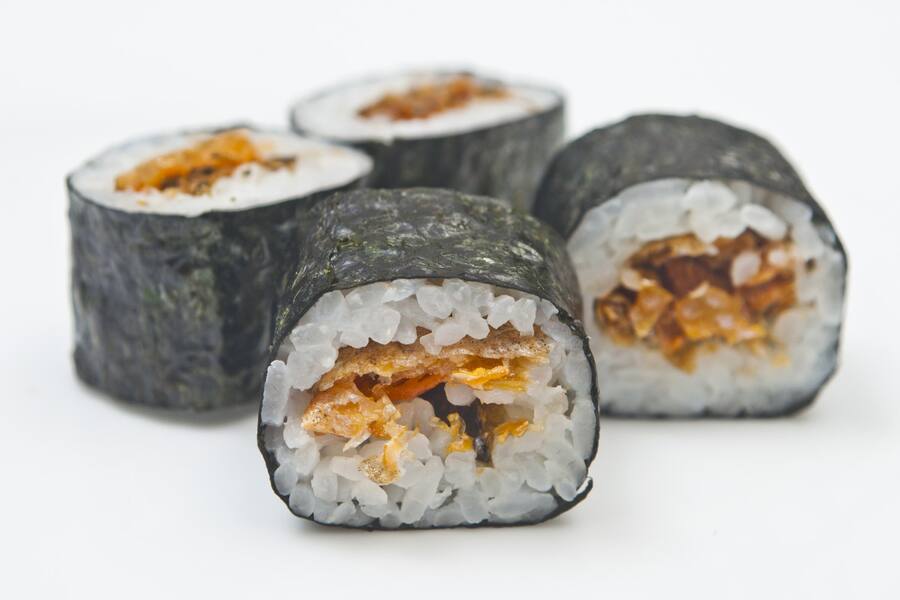 enrolado de alga com arroz, camarão, cream cheese e empanado e frito